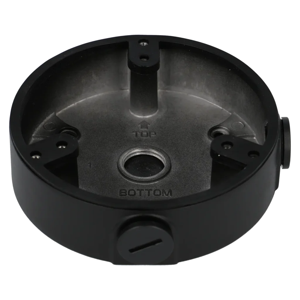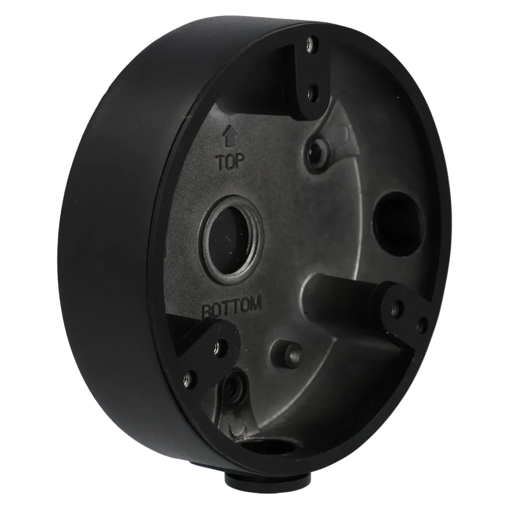 De aluminium behuizing biedt een stevige en duurzame montagebasis, terwijl de zwarte afwerking perfect aansluit bij donkere camera’s en installaties. Geschikt voor zowel binnen- als buitentoepassingen.